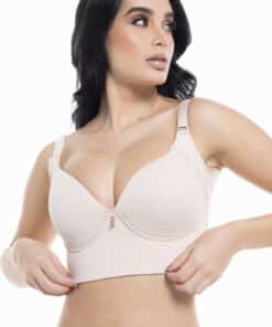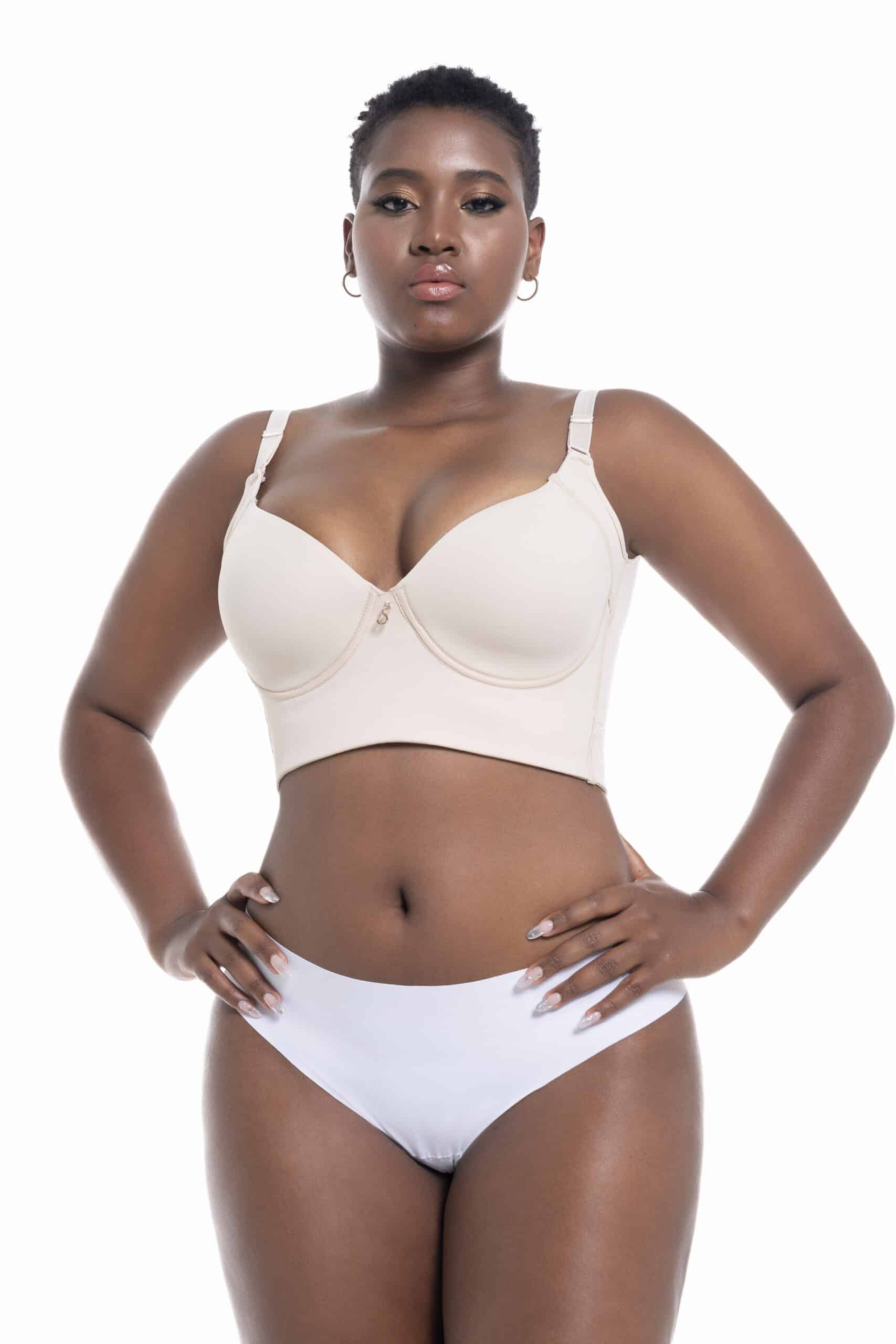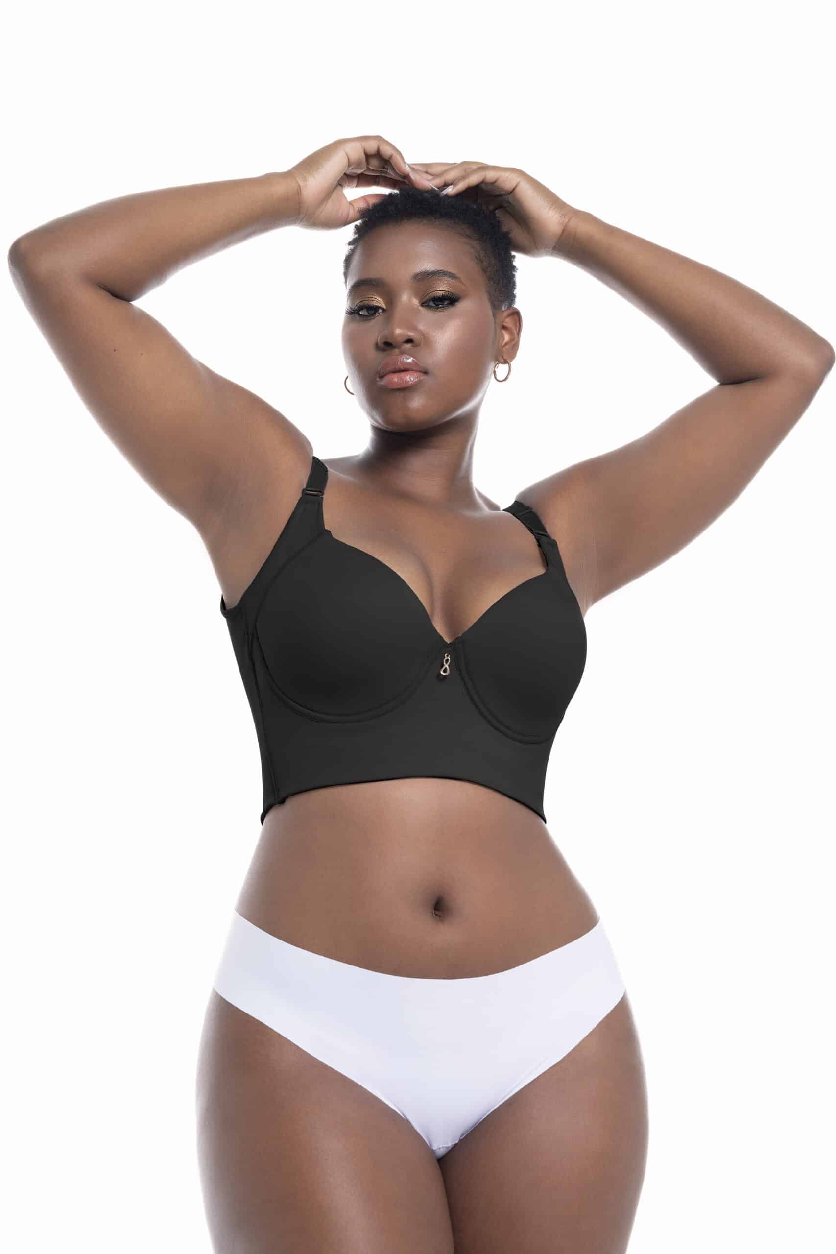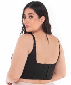 Underwire bra with a back adjustable by 3 rows of hooks. Adjustable and detachable straps. Features a deep back neckline. Can be worn over our corsets and bodysuits.