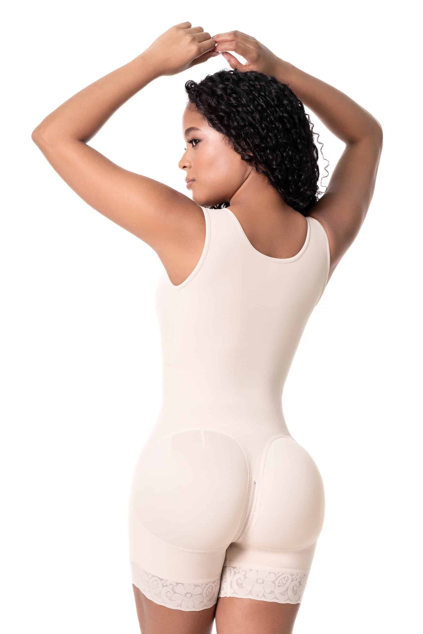 3 rangées de crochets ajustables pour resserrer le niveau de compression au fur et à mesure et selon votre désir. Ouverture périnéale à zip pour plus de confort pour les commodités.